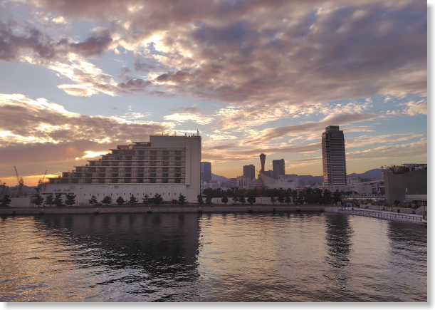黄昏時のGLION ARENA KOBEからポートタワー方面を見る